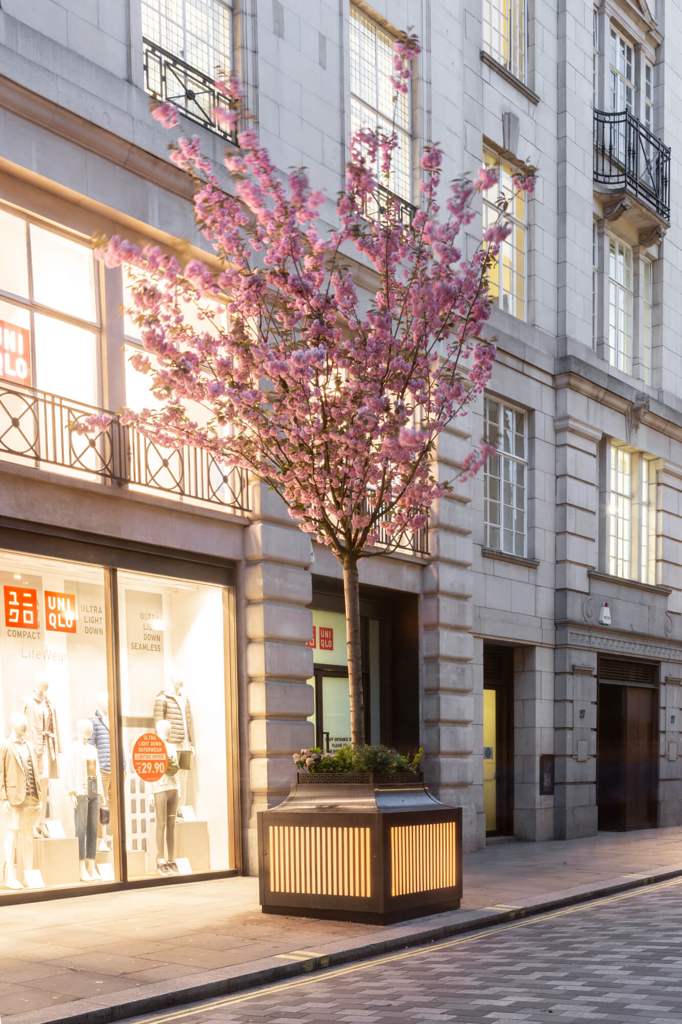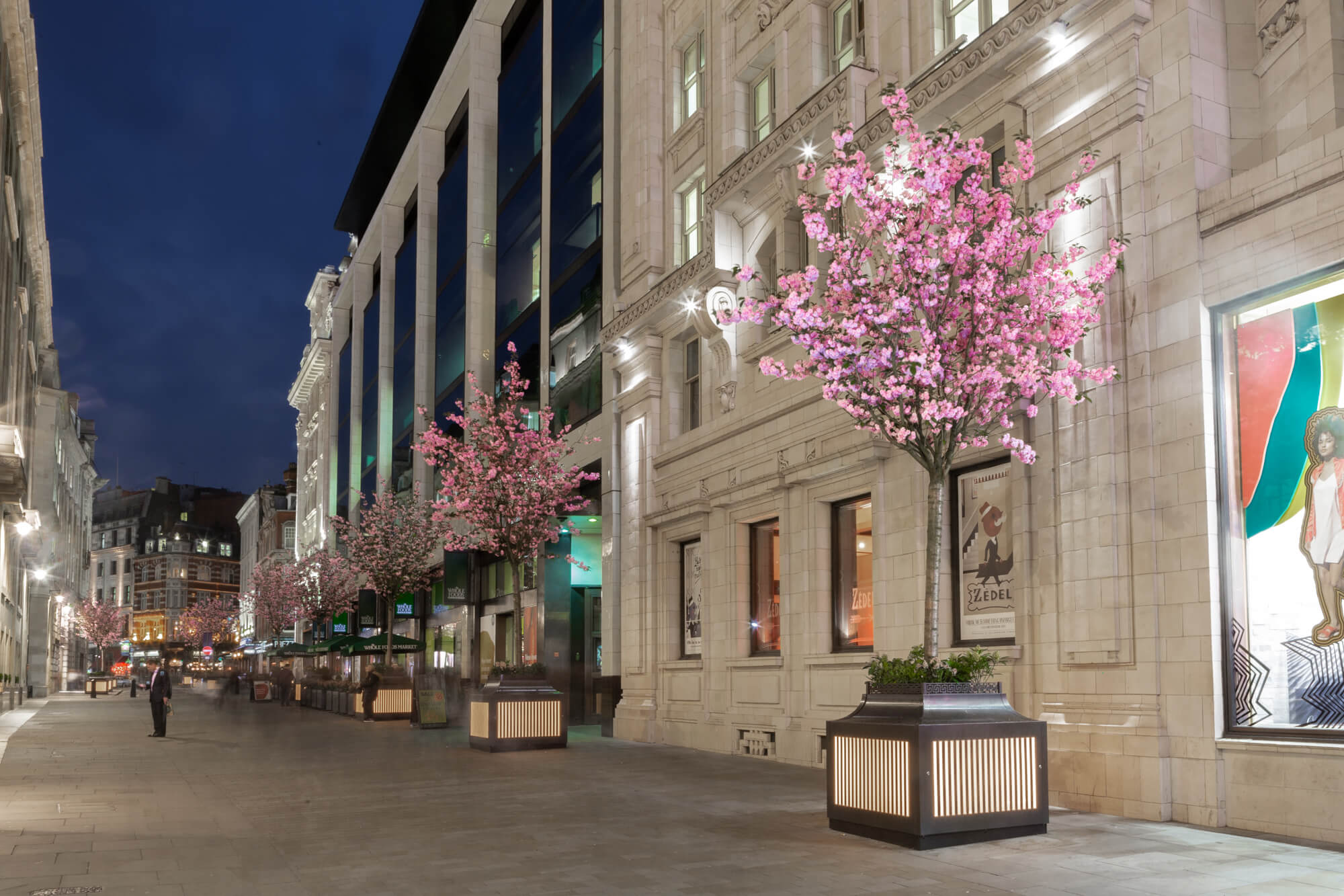 The project scope included the design and manufacture of these products, storage, delivery and offloading, positioning and installation. The location is a very busy and high profile street in central London – Glasshouse Street / Piccadilly Circus. The tree planters include recessed LED illumination and the movable planters were designed with retractable wheels and ‘dead man’ breaks for safety, both products are constructed with very complex fabrications in stainless steel and patinated phosphor bronze cladding.